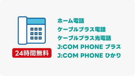 ホーム電話から、ホーム電話、ケーブルプラス電話、ケーブルプラス光電話、J:COM PHONE プラス、J:COM PHONE ひかりへ24時間いつでも通話無料です。