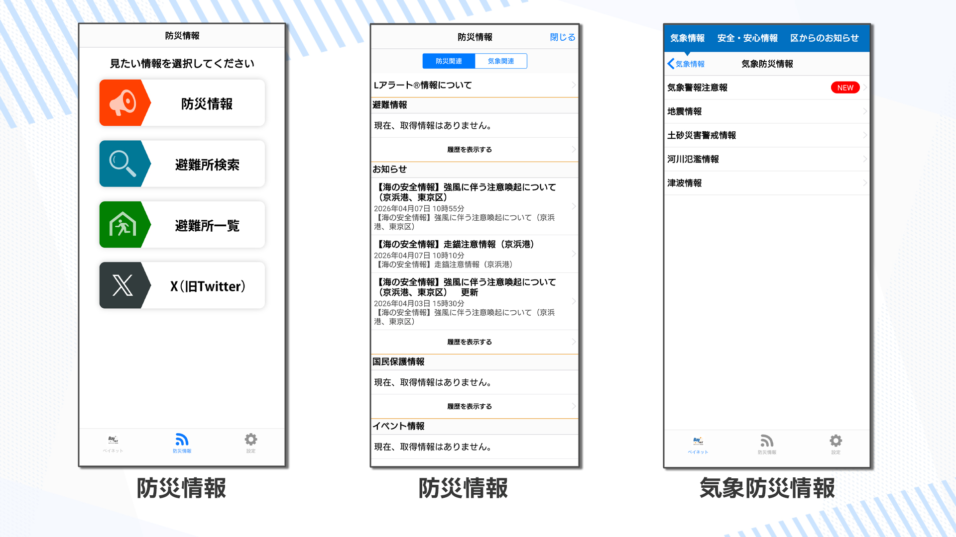 また、災害発生時は江東区・中央区などの行政区から配信される正確な情報を得ることができます。
