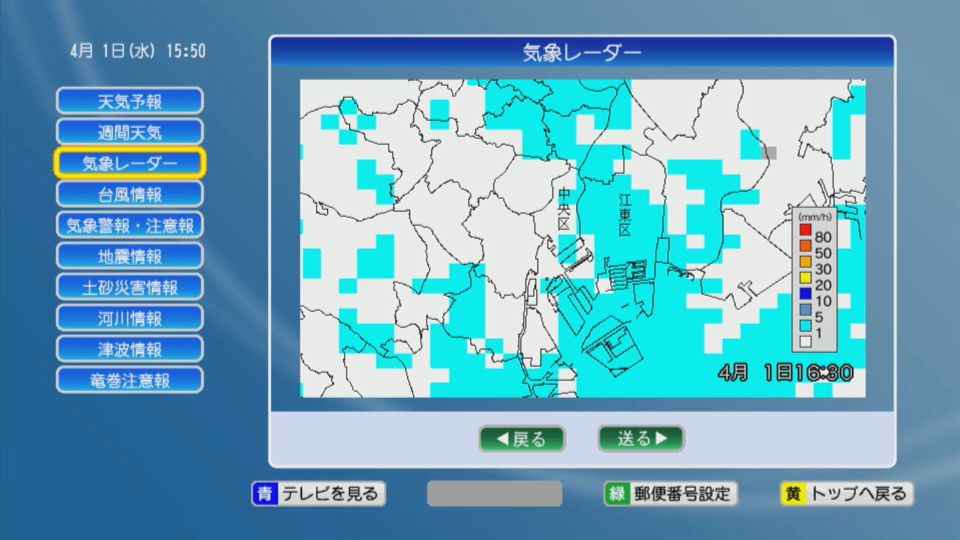さらに、気象レーダーでは、雨がどの地域で降っているか、時間ごとの降水情報が一目で分かります。